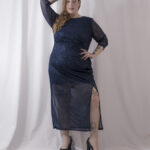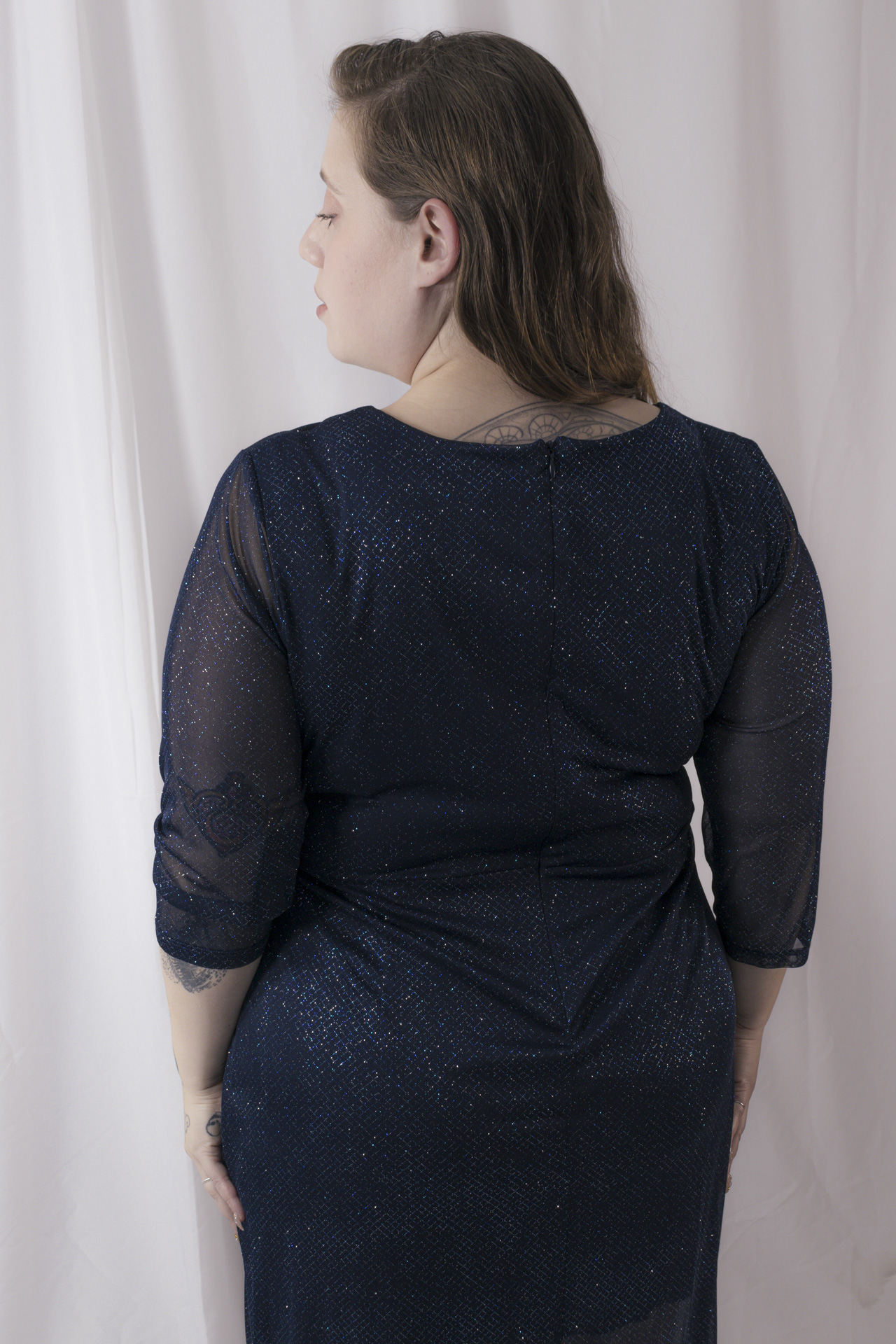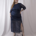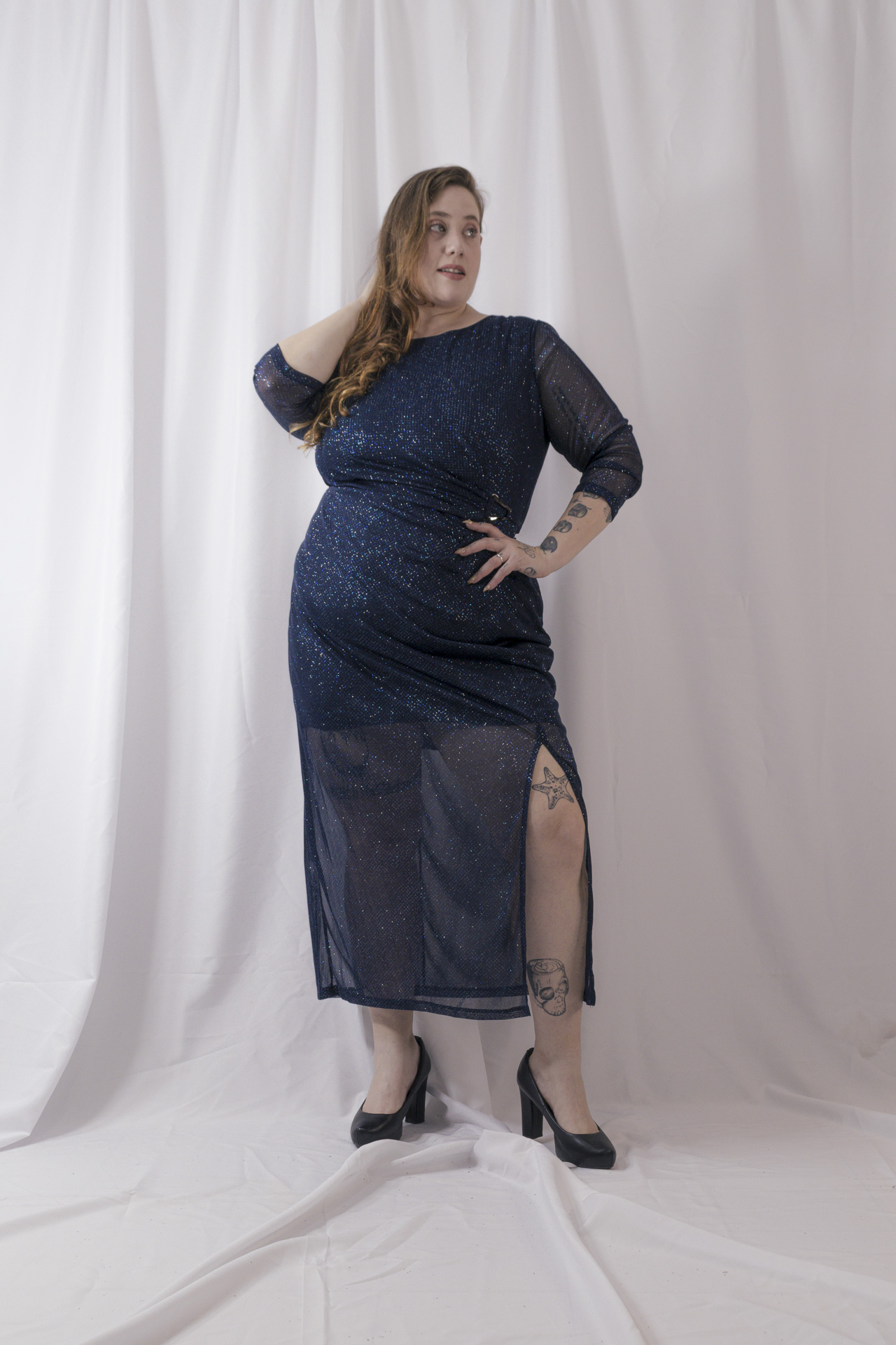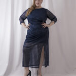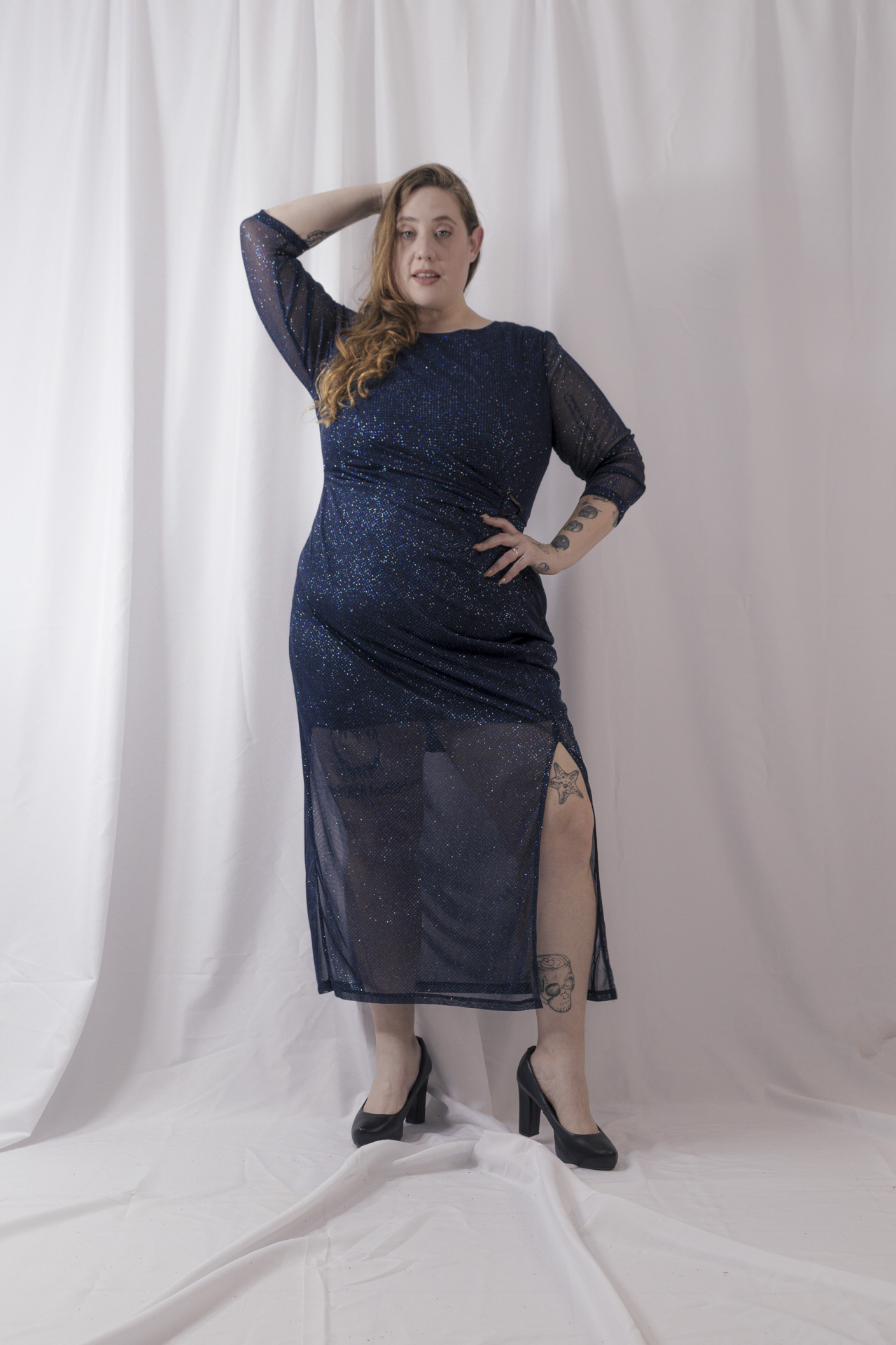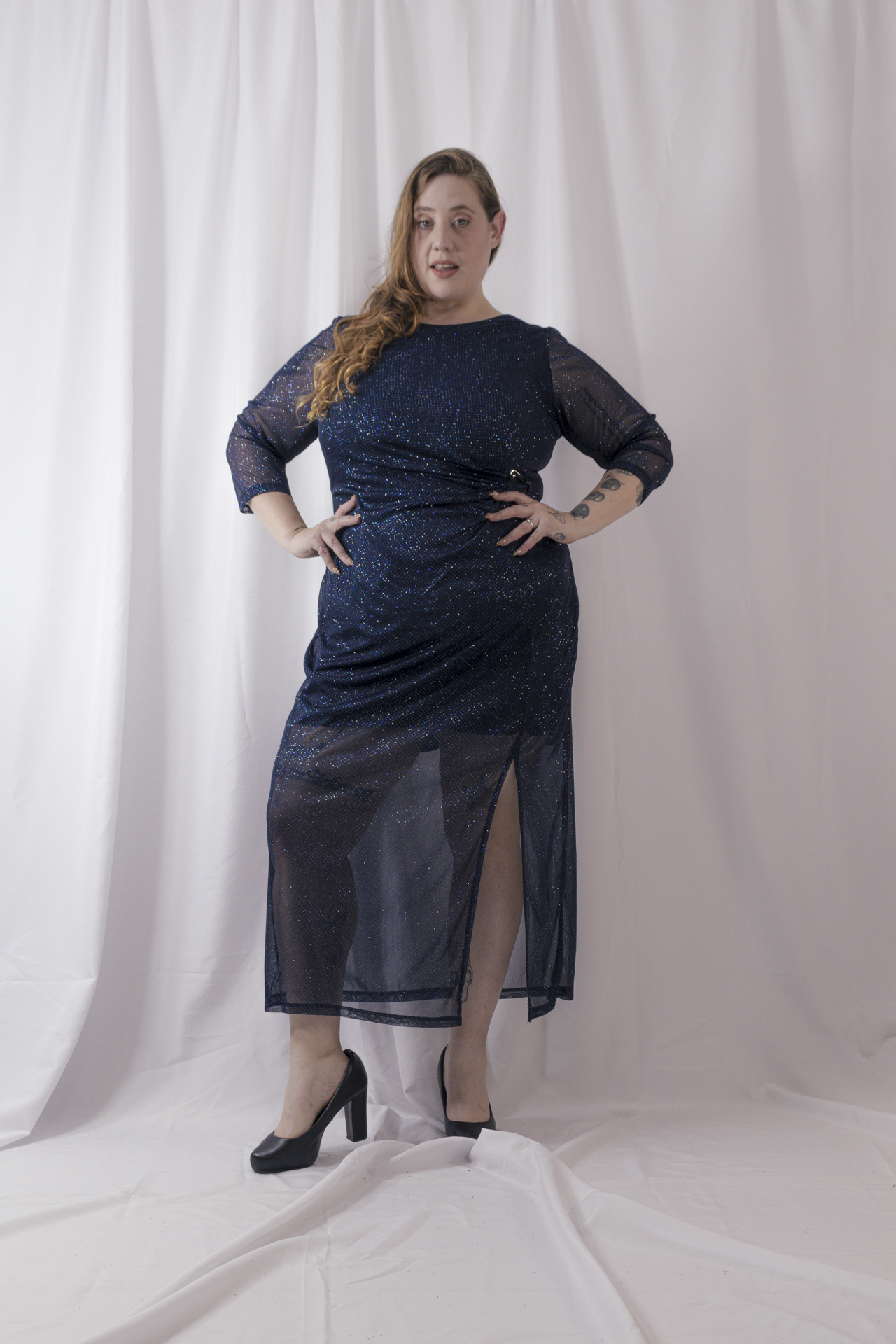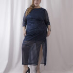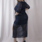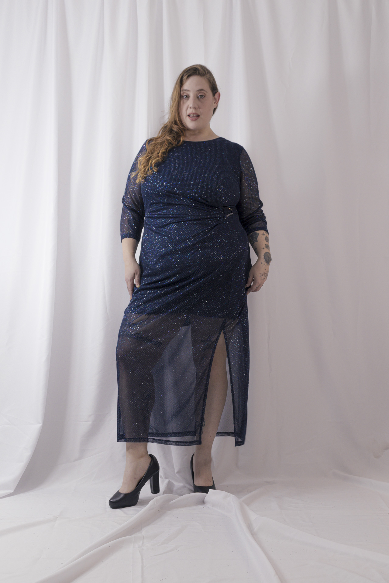 Vestido Azul midi, ÚNICO, de tul con brillo y transparente, abajo da hasta el talle 4.