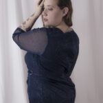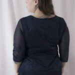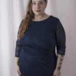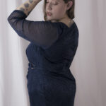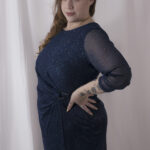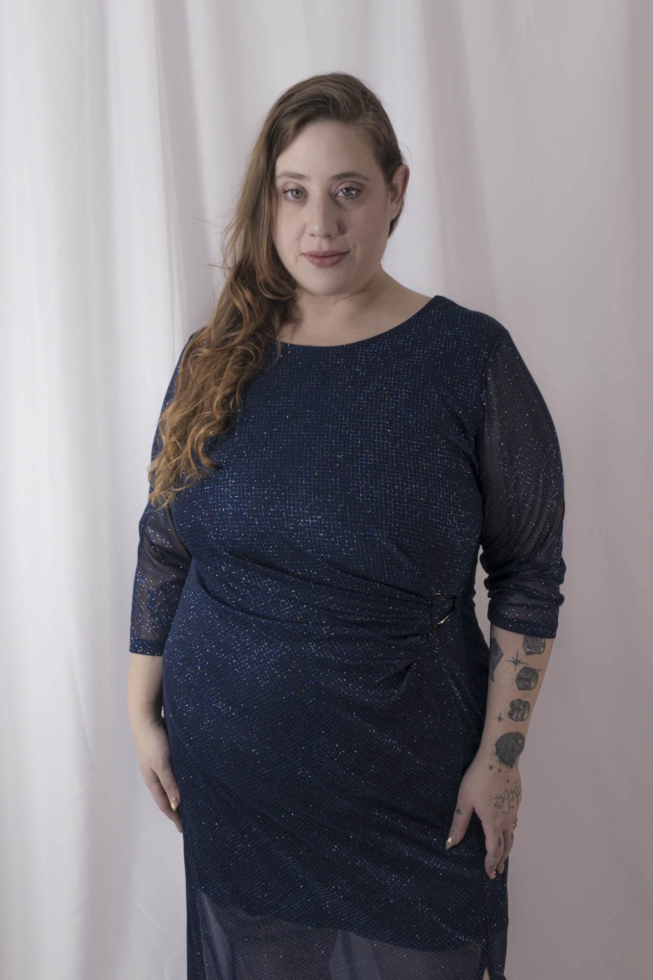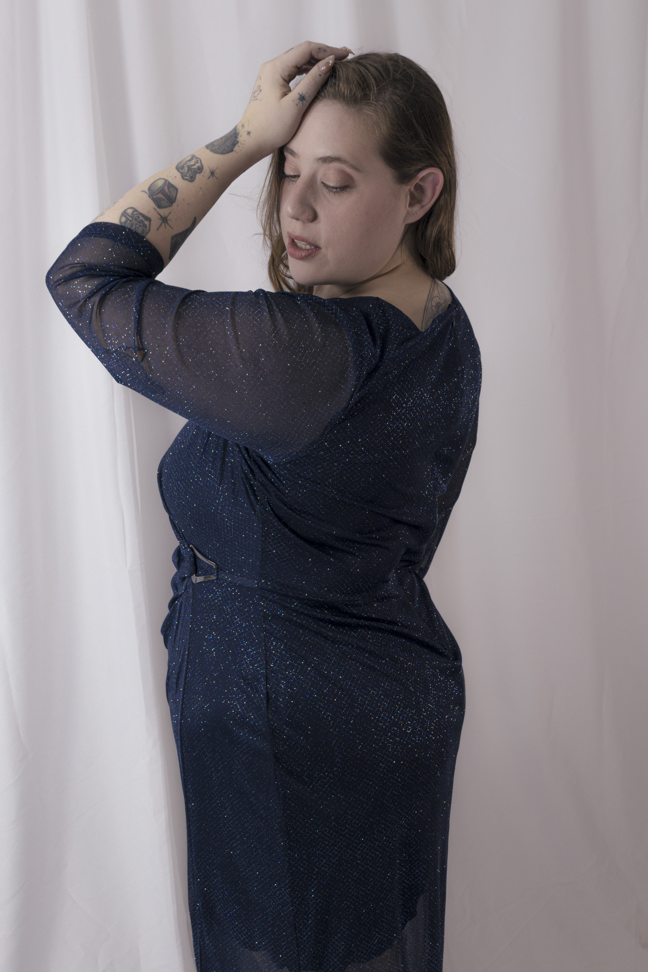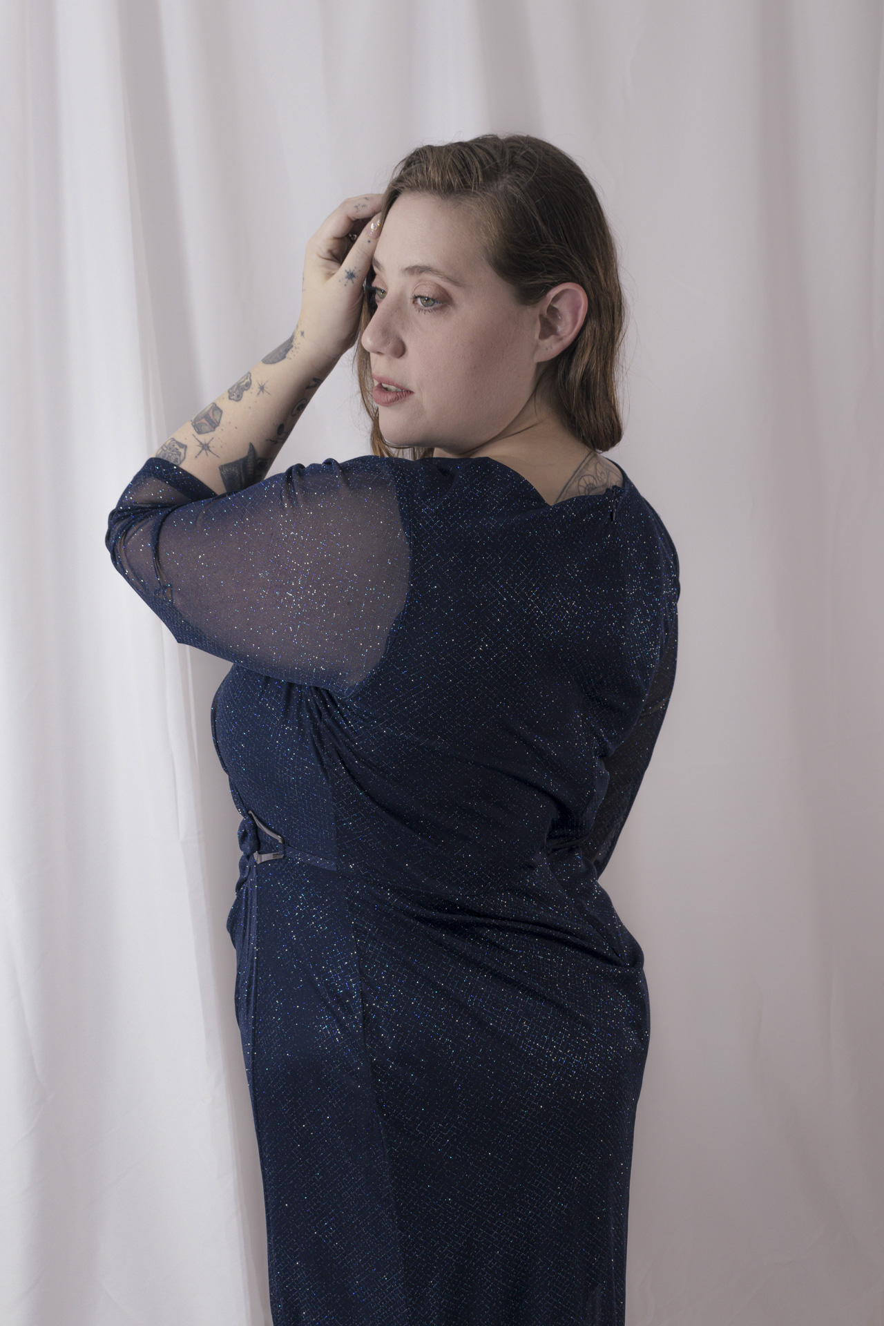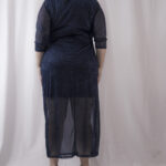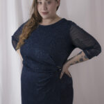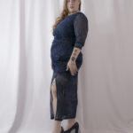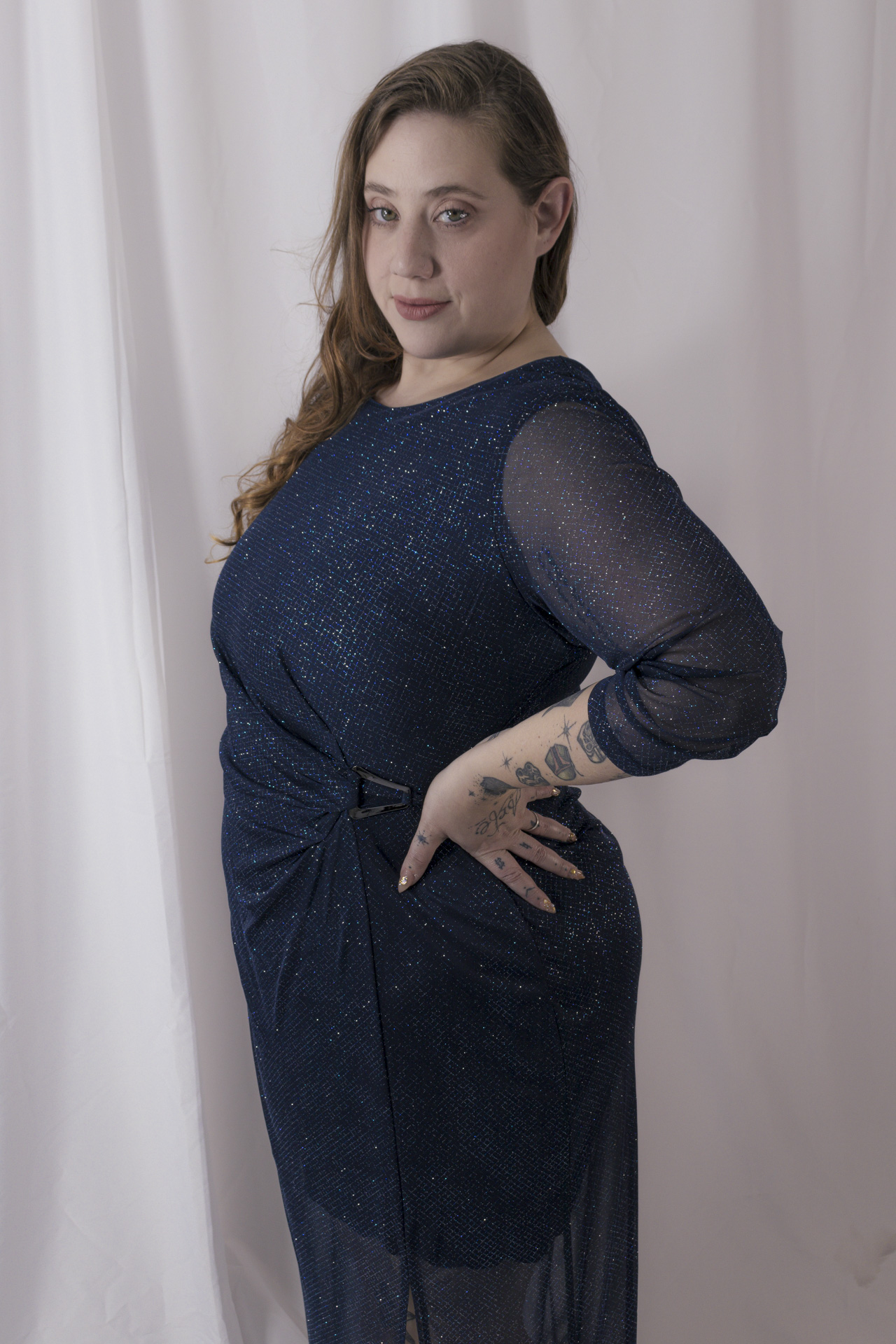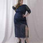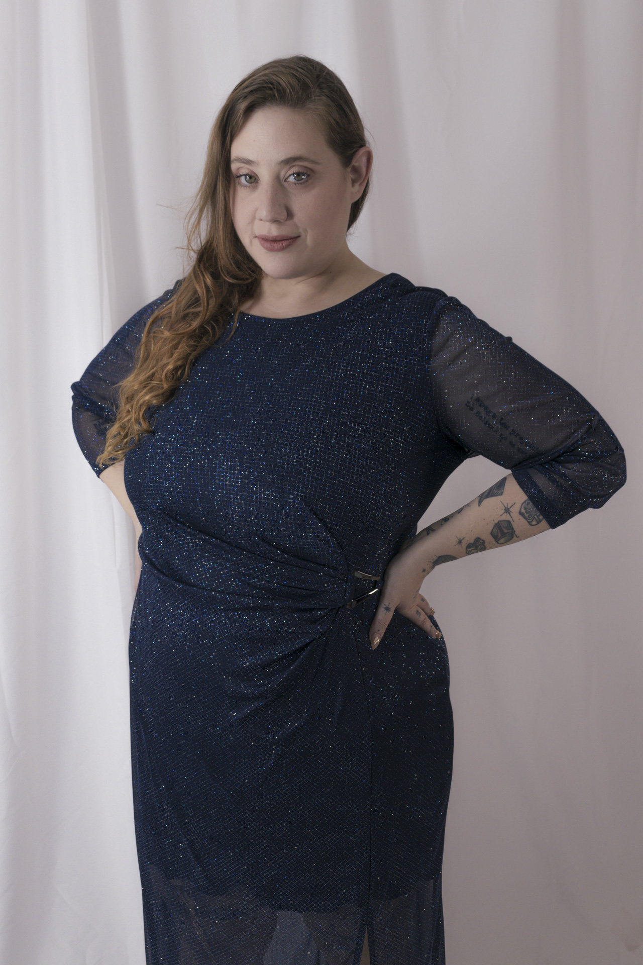 Vestido Azul midi, ÚNICO, de tul con brillo y transparente, abajo da hasta el talle 4.
