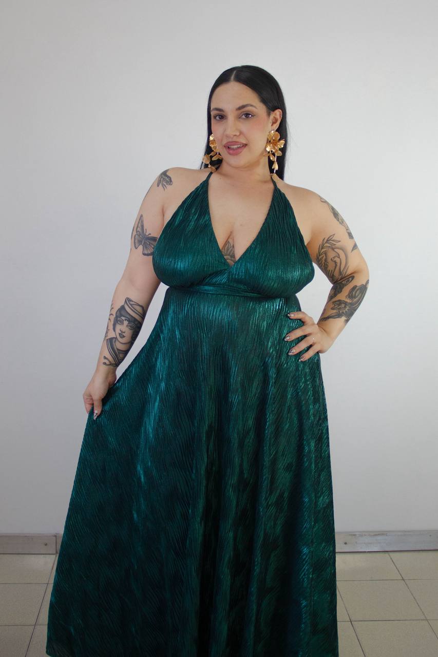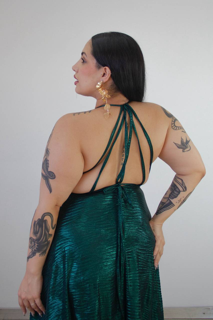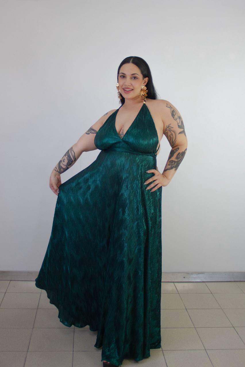 Vestido en tela plisada con tiras finita y caída espectacular. Talle XL Verde Inglés brillante y Natural brillante