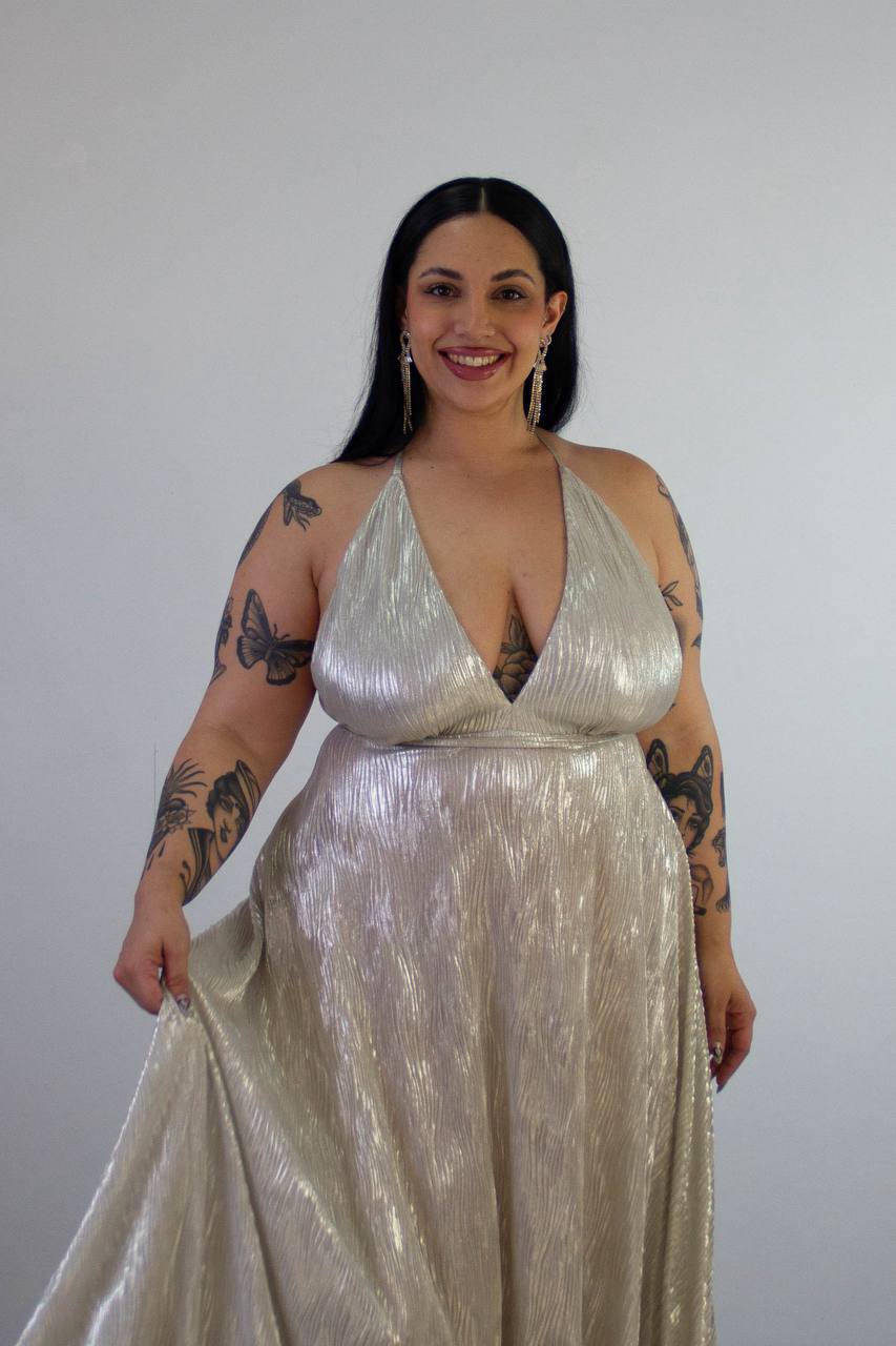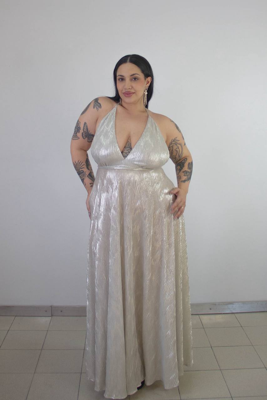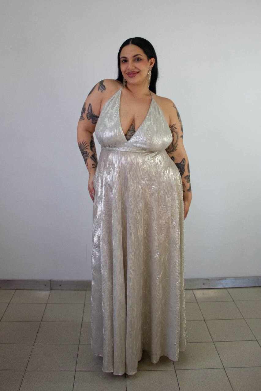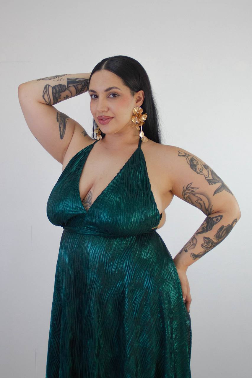 Vestido en tela plisada con tiras finita y caída espectacular. Talle XL Verde Inglés brillante y Natural brillante