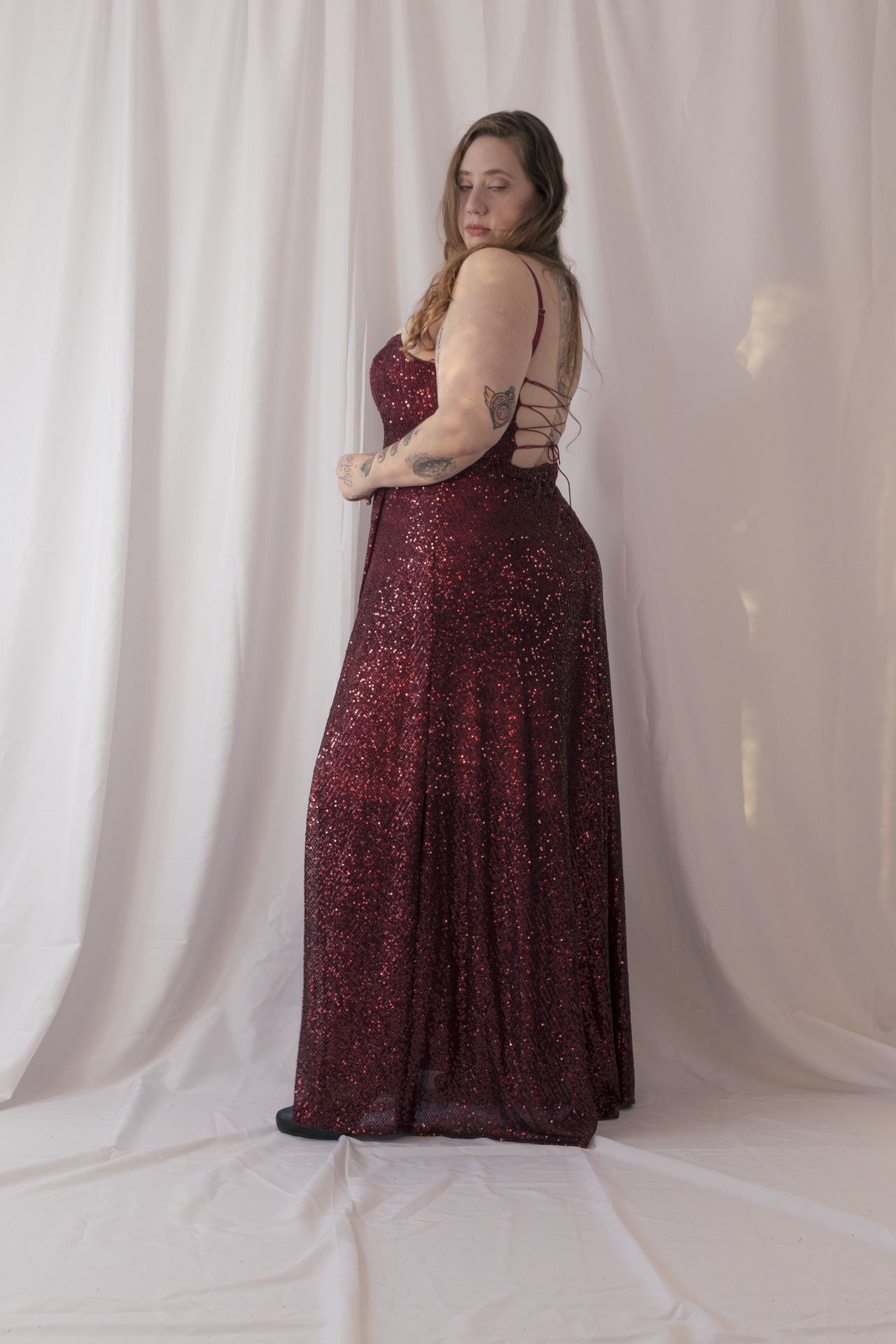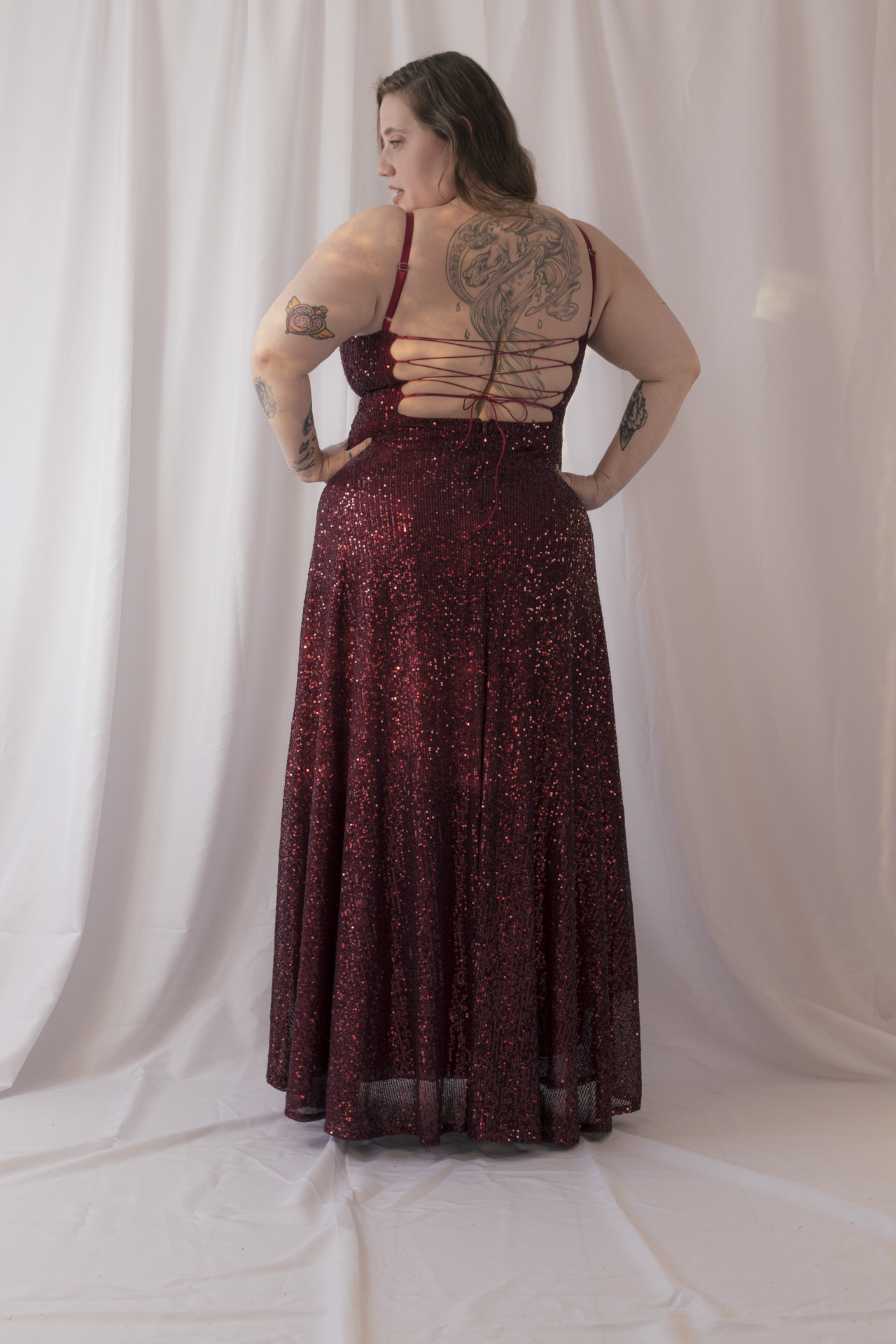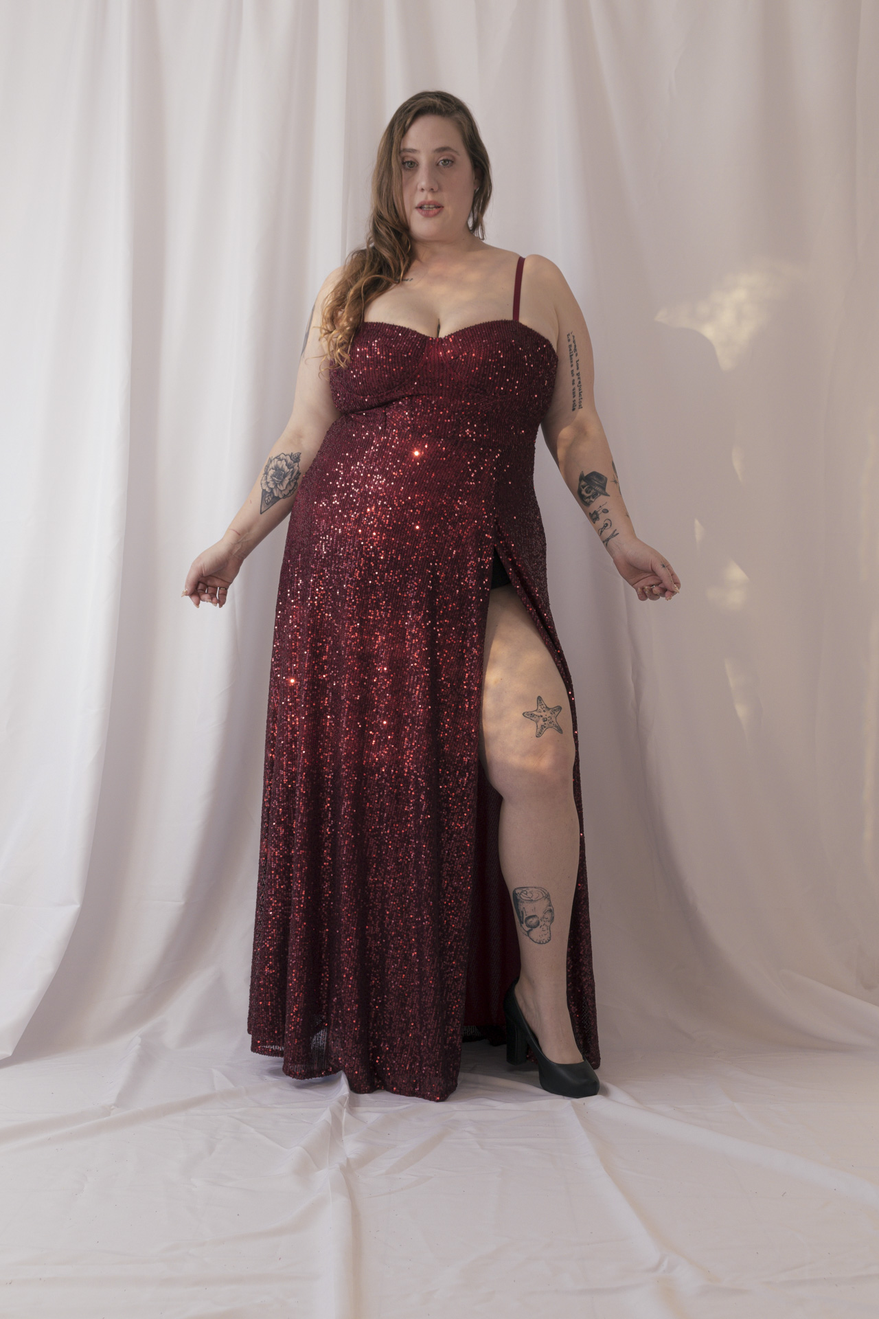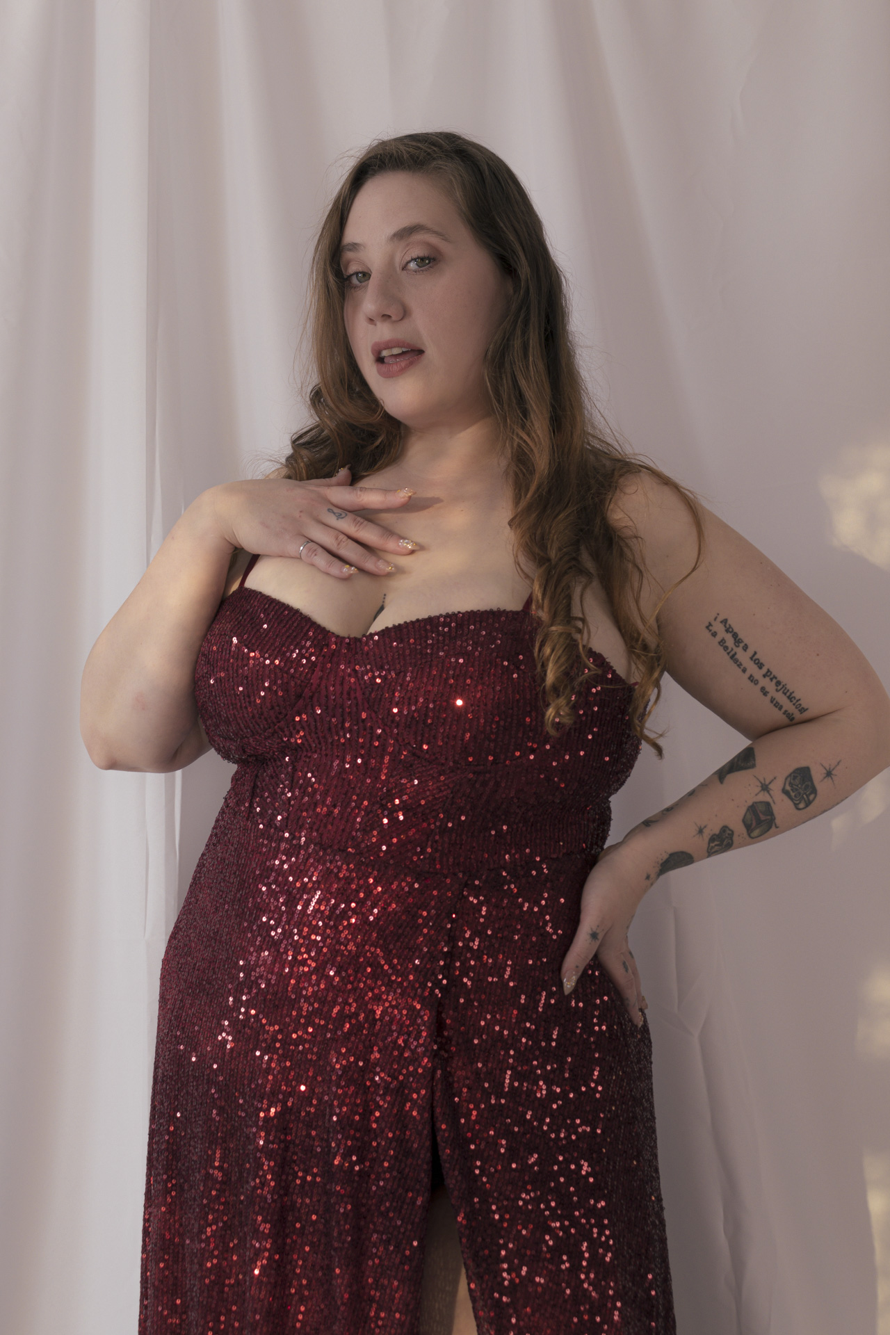 Vestido Noruega de lentejuelas íntegramente forrado, con falso corset y espalda cruzada.