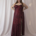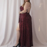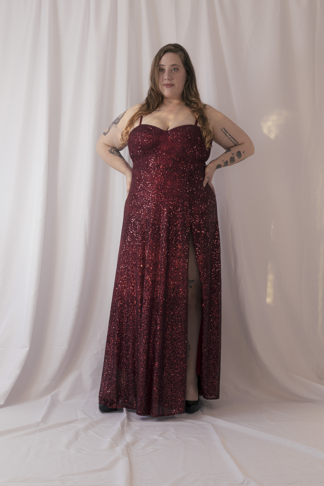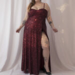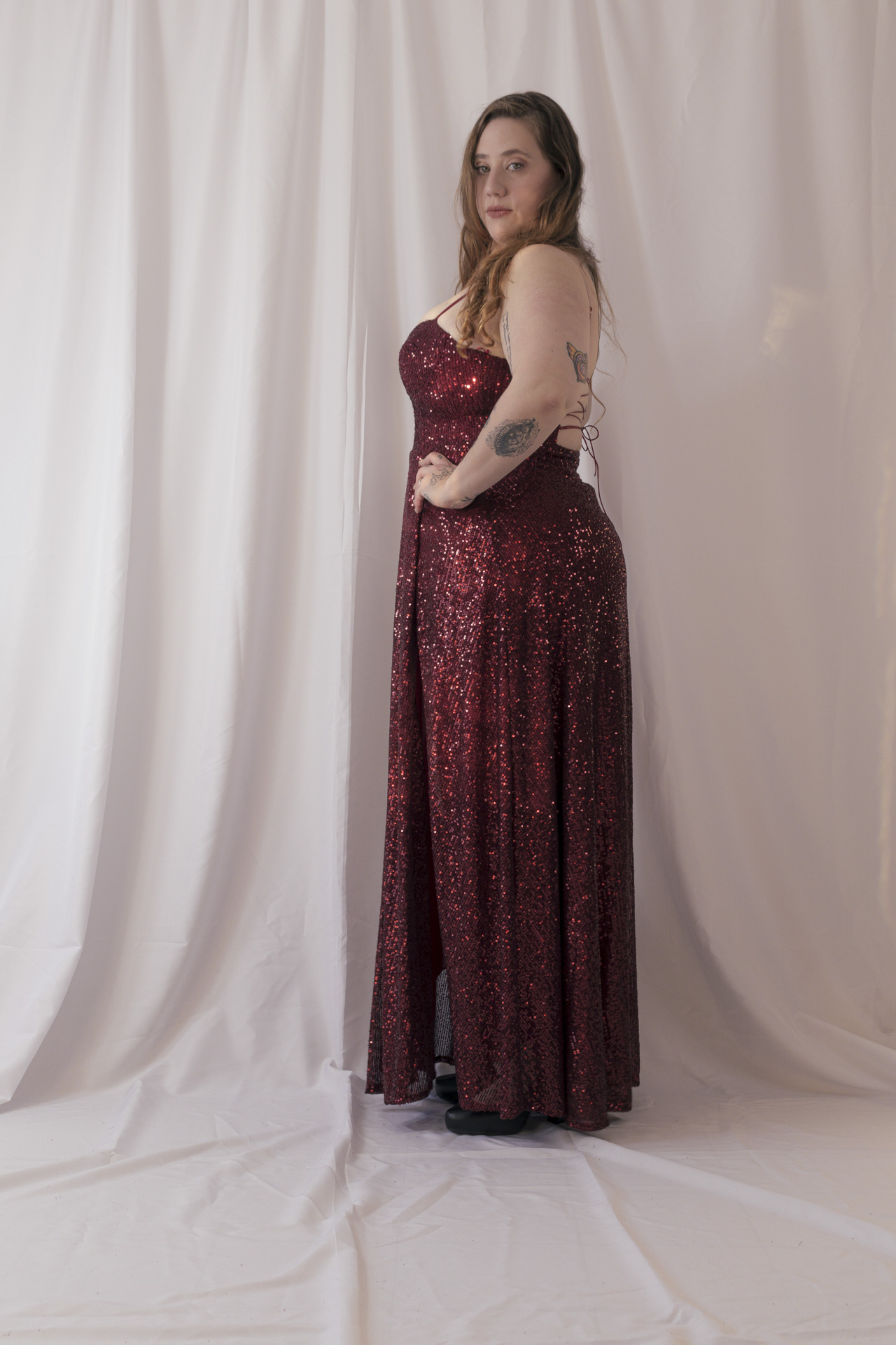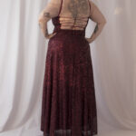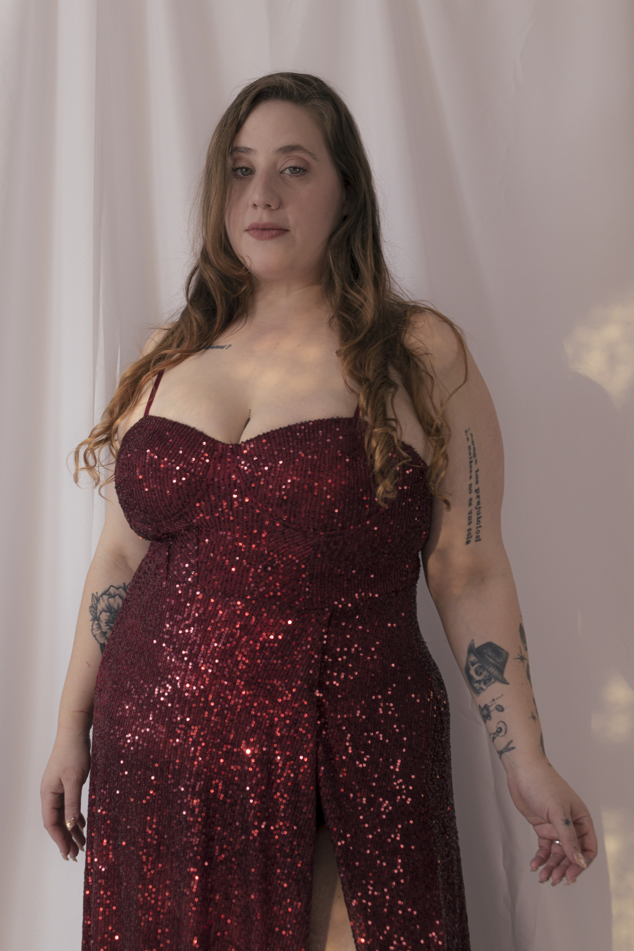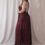 Vestido Noruega de lentejuelas íntegramente forrado, con falso corset y espalda cruzada.