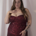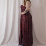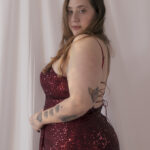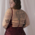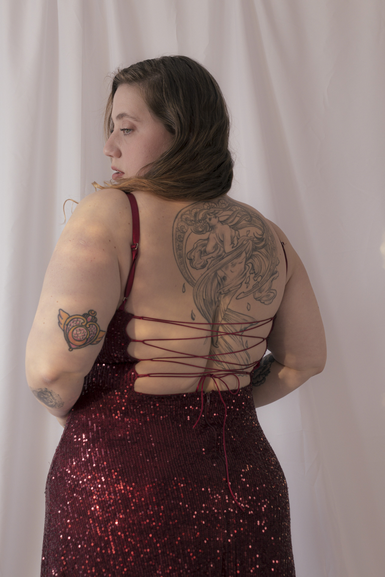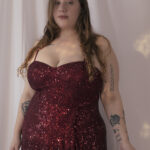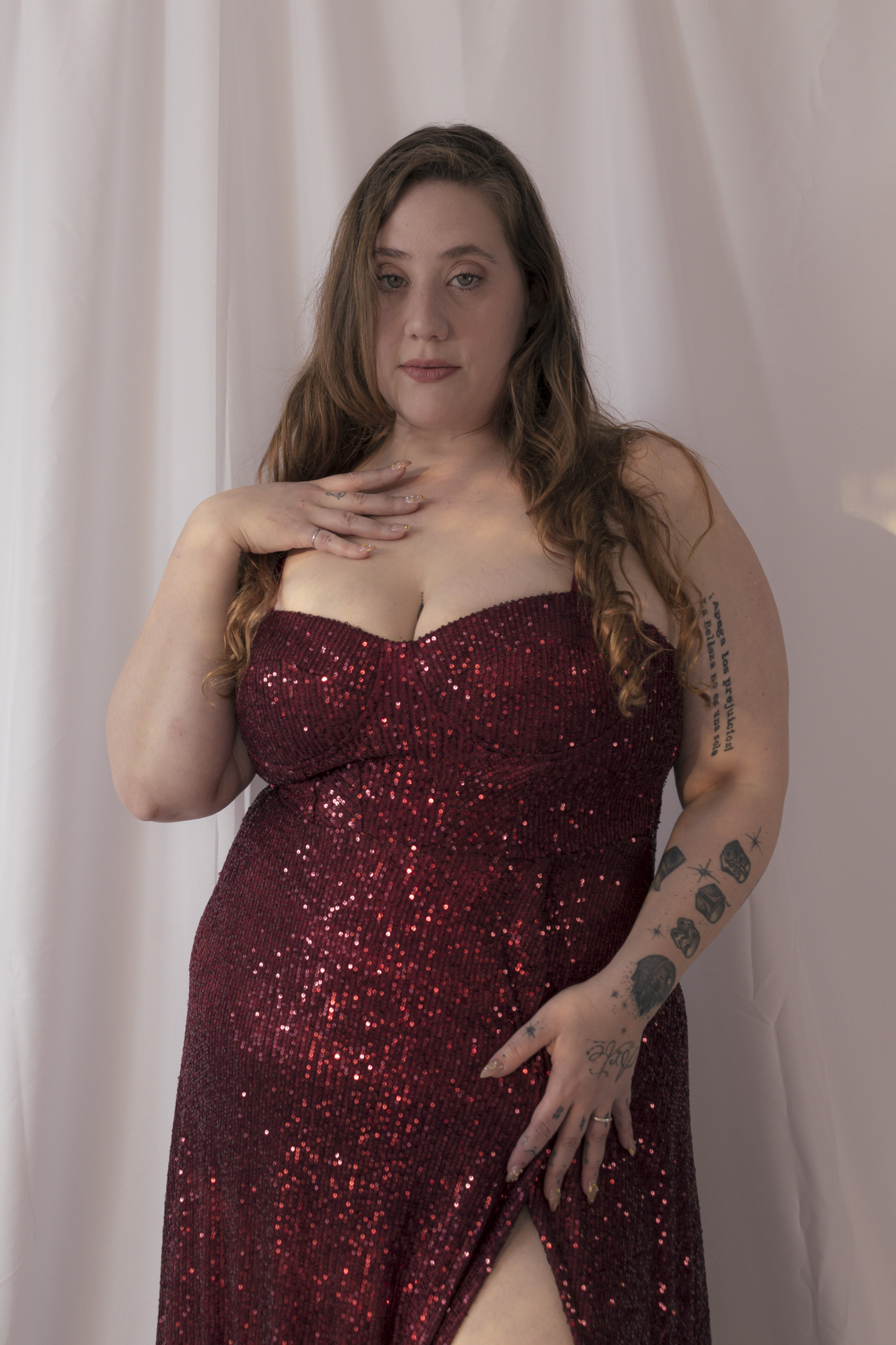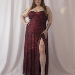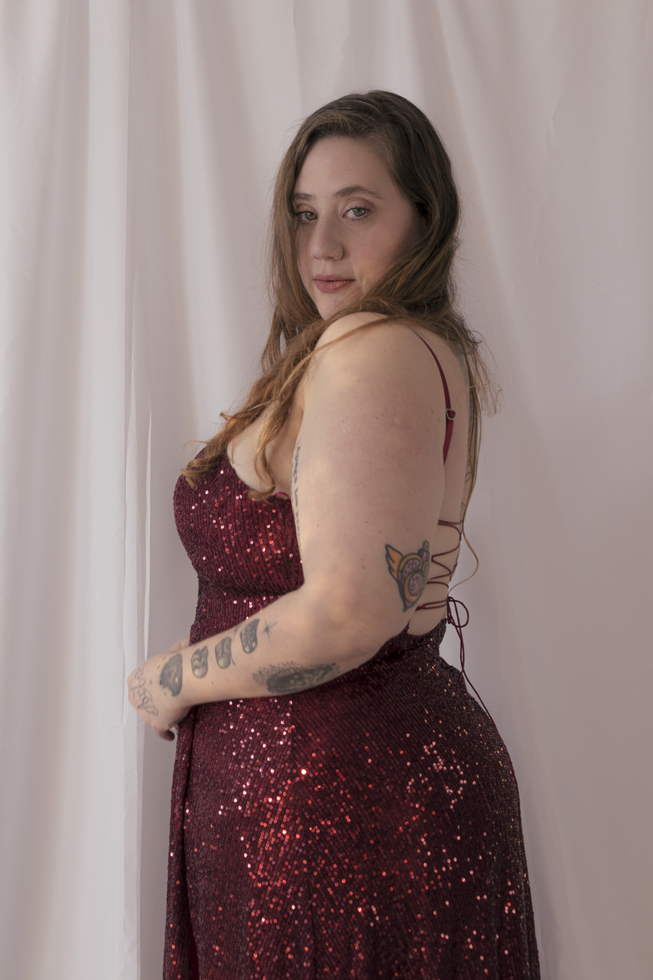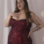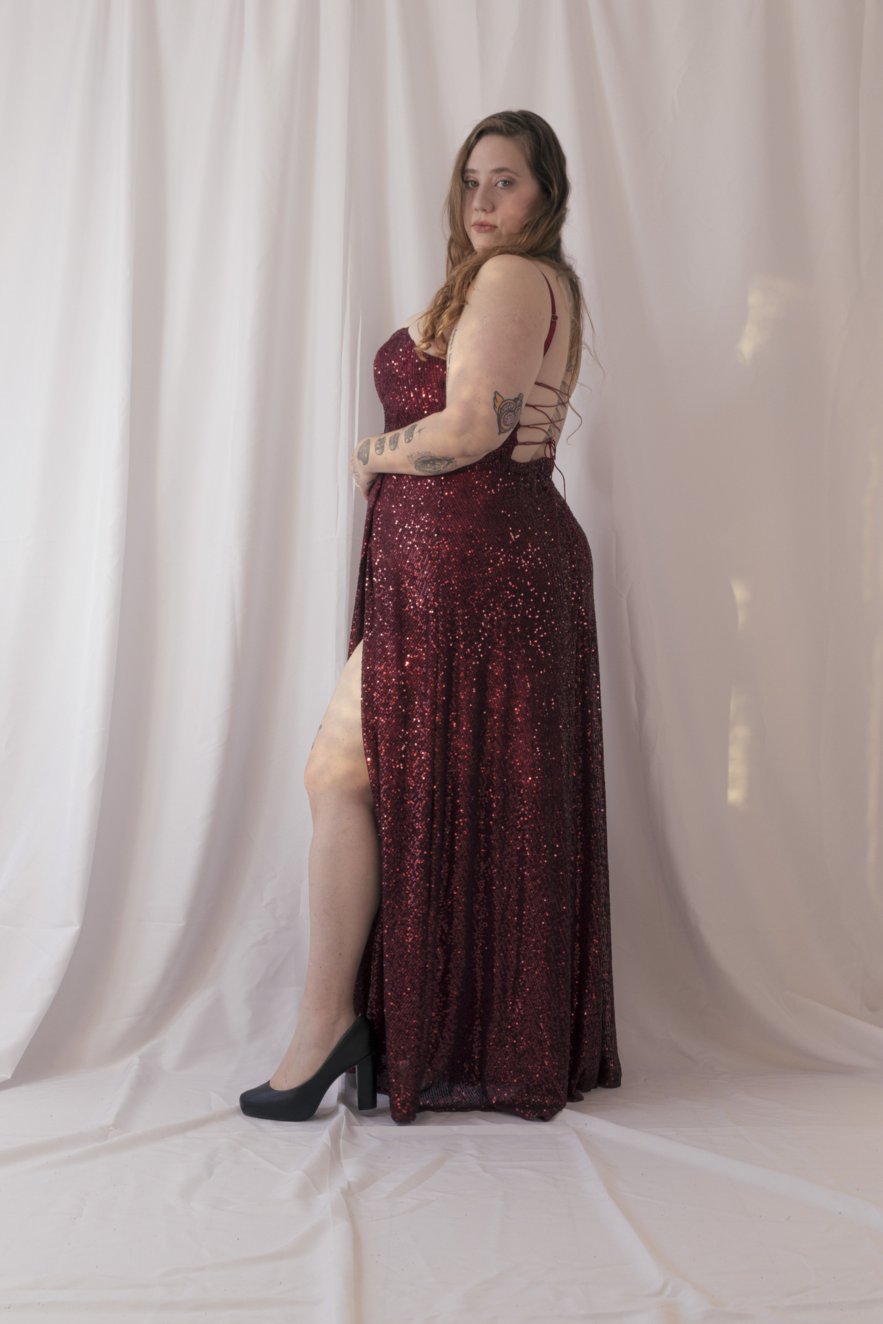 Vestido Noruega de lentejuelas íntegramente forrado, con falso corset y espalda cruzada.