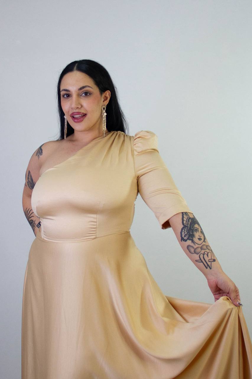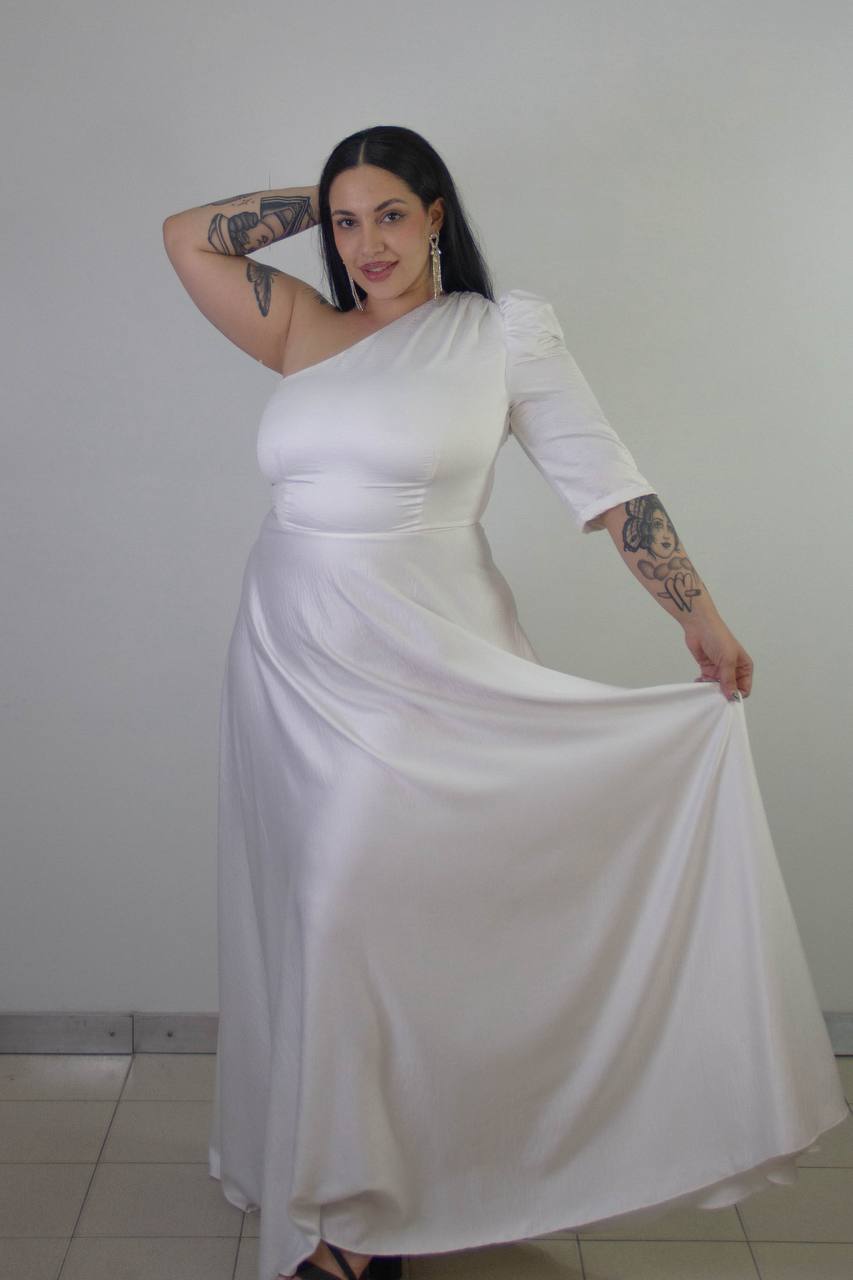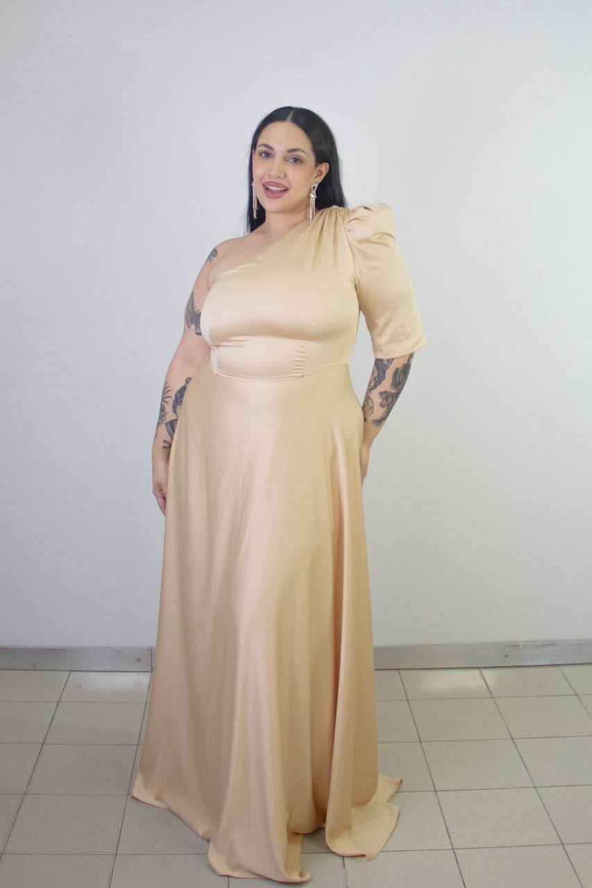 Vestido de creppe de una sola manga y falda amplia.